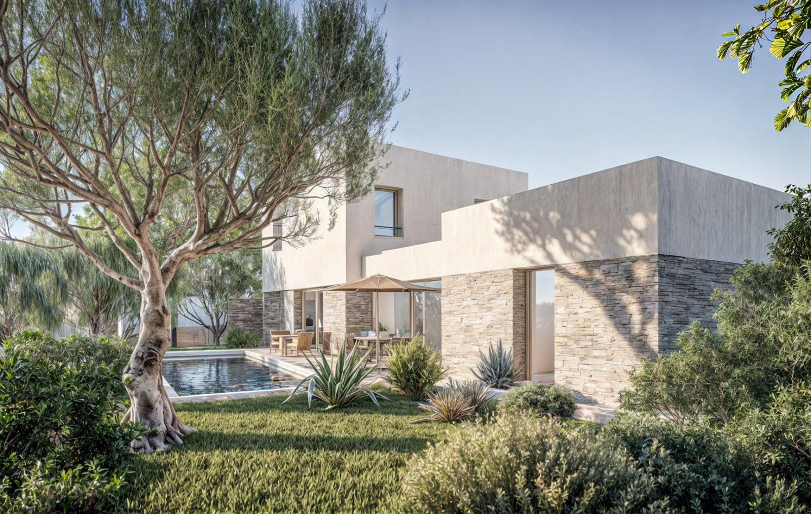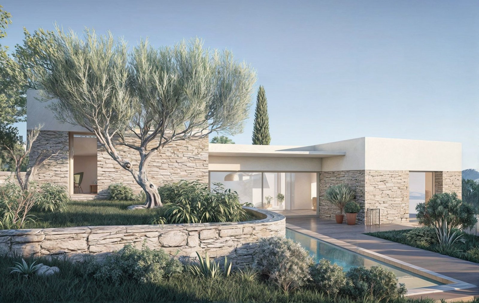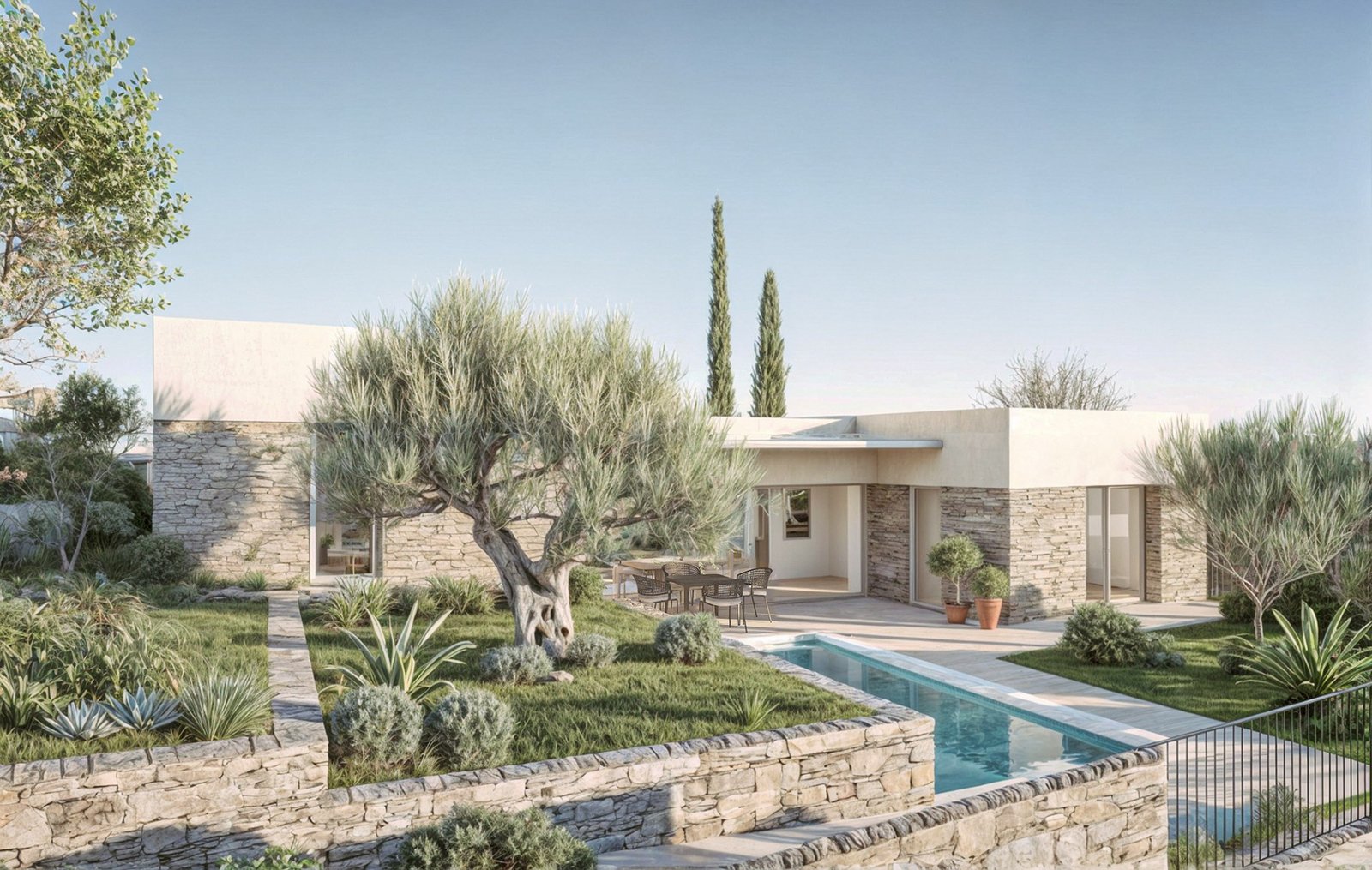 Le programme valorise le patrimoine provençal en combinant architecture contemporaine, respect du bâti existant et intégration paysagère soignée. Chaque implantation a été étudiée pour préserver les vues, la topographie naturelle et la végétation existante. Le domaine s'inscrit dans un paysage de restanques, d'oliviers et de jardins méditerranéens.
